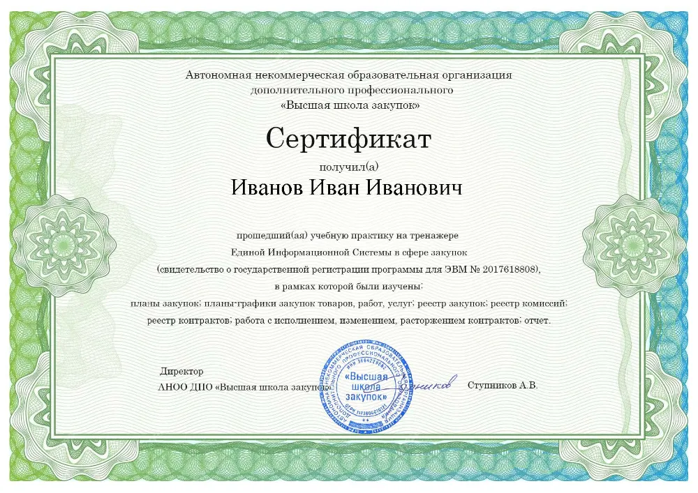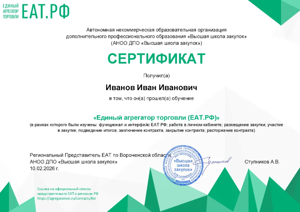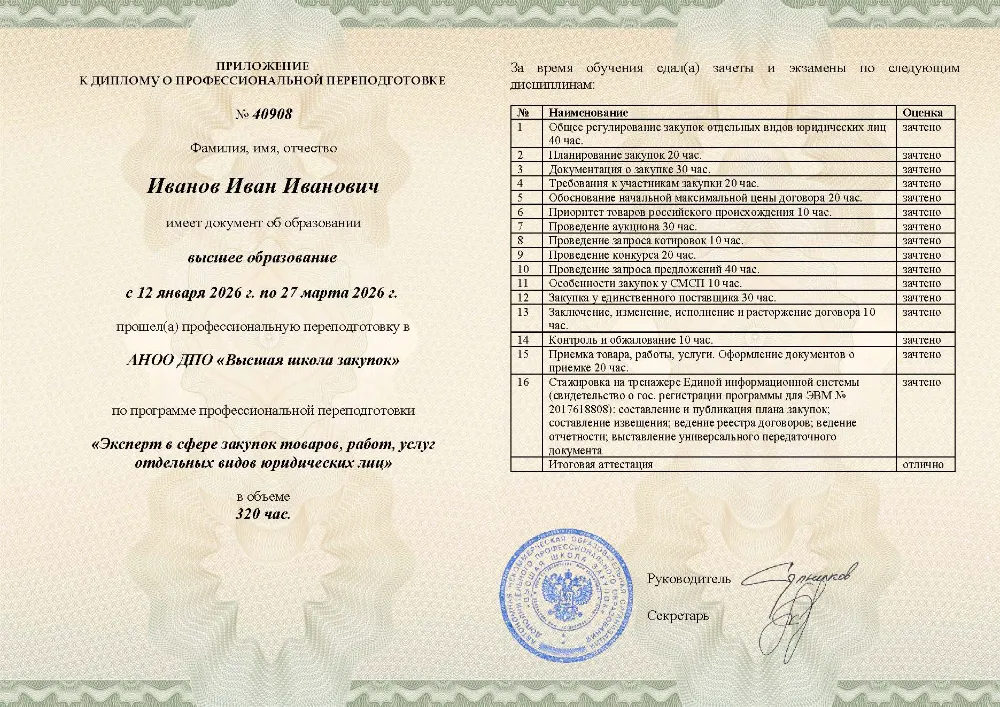 Высшее образование (любой профиль) ИЛИ среднее профессиональное образование + дополнительное профессиональное образование в сфере закупок